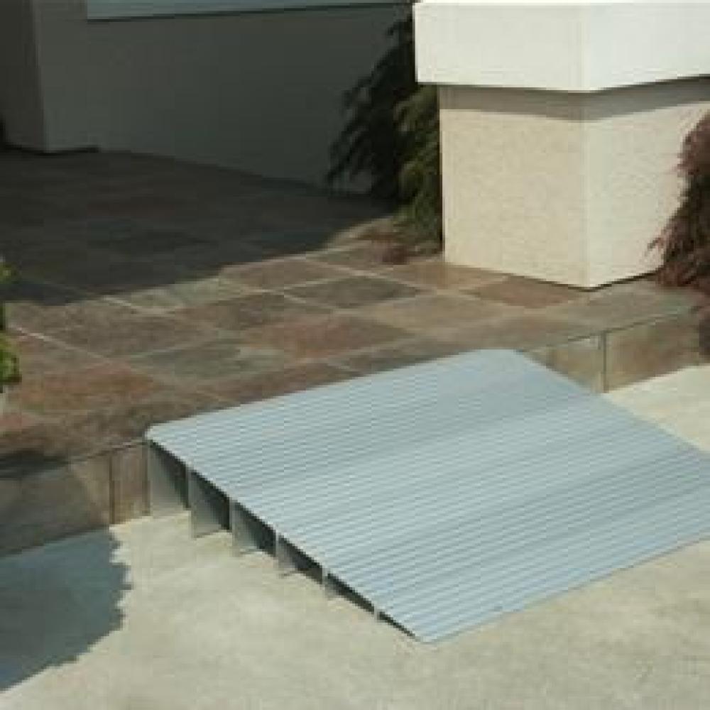 The EZ-Access® Modular Threshold ramp is a lightweight yet durable free-standing ramp designed for doorways, sliding glass doors and raised landings. The modular design, with its interchangeable components easily accommodates, updates thresholds from ¾” to 6” high. This seam-free ramp is 34” wide and ideal for use with wheelchairs, walkers, and cane users. Made of anodized aluminum and is intended for indoor or outdoor use.
